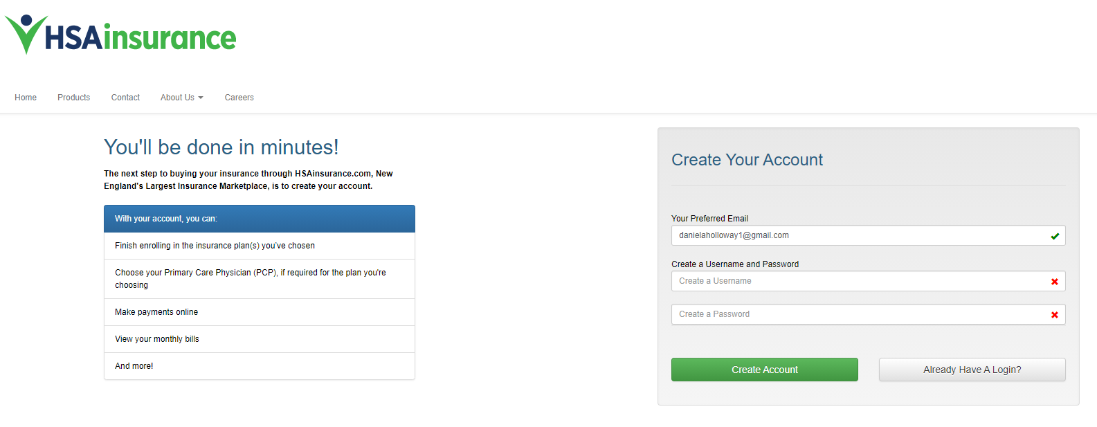 You will be prompted to create an account with HSA Insurance so you can complete enrollment in your selected plan. Please use the SAME EMAIL ADDRESS used for your benefitbay™ account. This should also be the SAME EMAIL ADDRESS used during the enrollment steps with HSA Insurance . Next, create a username and password for your HSA Insurance account. Then click Create Account.