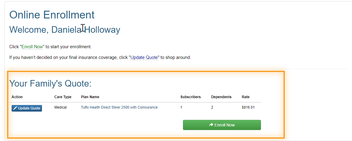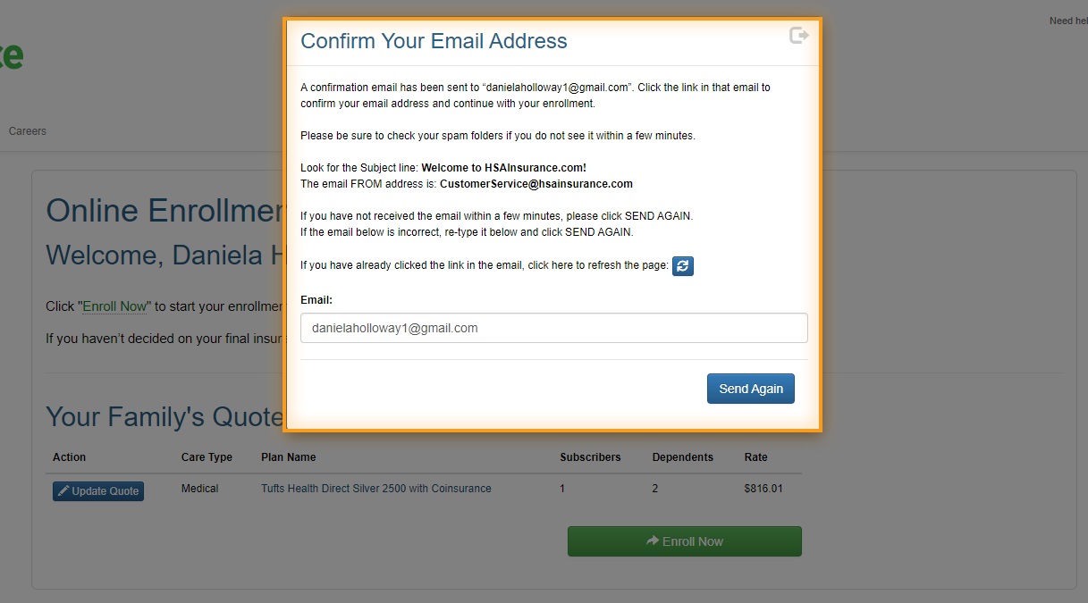 After you verify your email address HSA Insurance will display your chosen plan information. You will have the opportunity to change from your selected plan by clicking Update Quote. Otherwise, click Enroll Now to complete the purchase of your new plan.