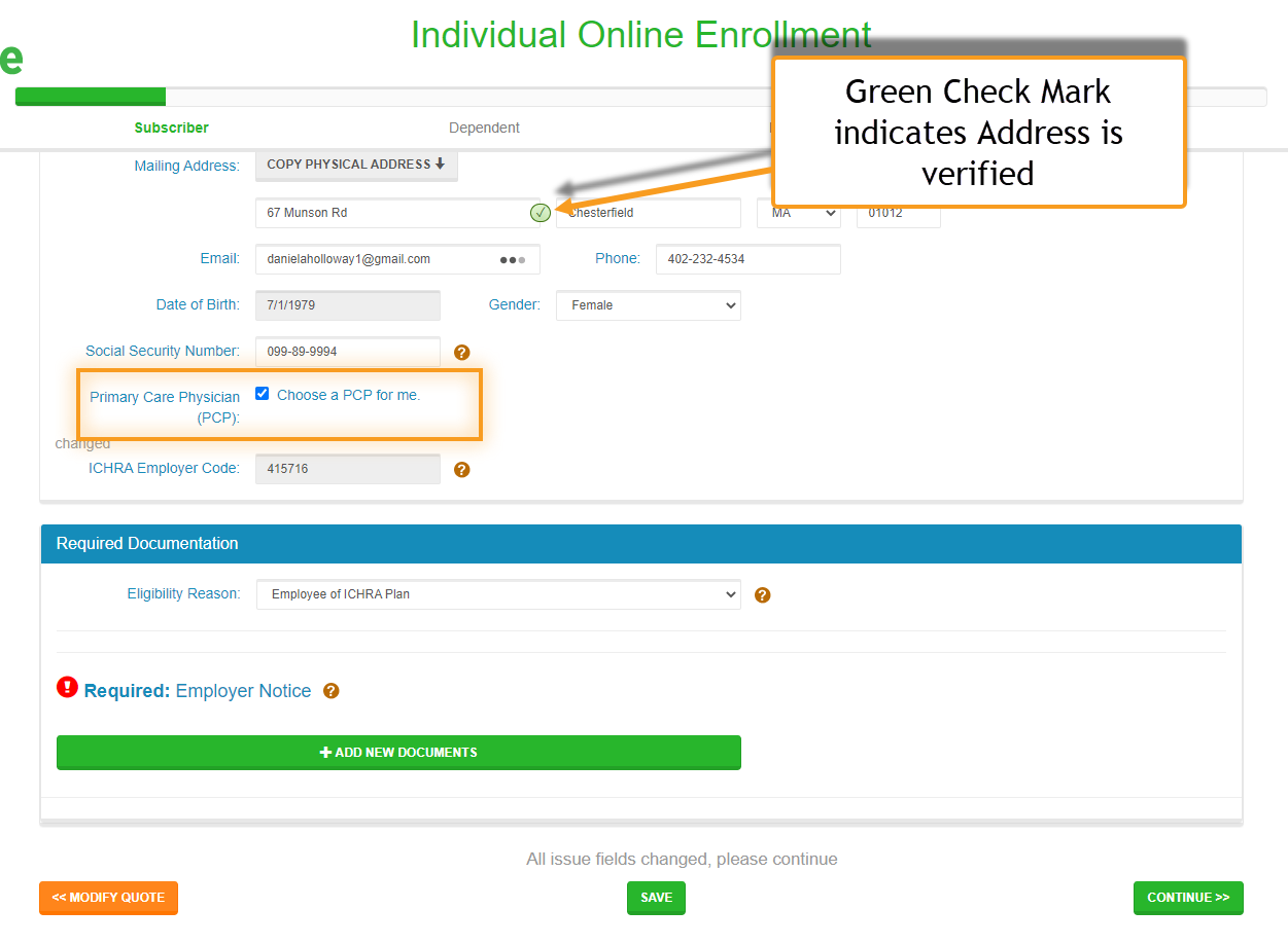 In the next screen, go ahead and enter the required fields. Your physical address will require validation. HSA Insurance uses an Address Verification System to ensure the accuracy of your address. A green check-mark will display for all verified addresses. *If you have any issues entering your address please contact benefitbay™ support using the blue chat bubble located in the bottom right-hand corner of your benefitbay™ employee portal.