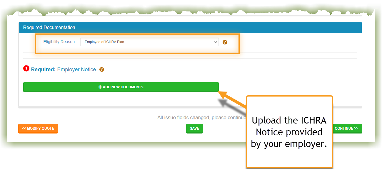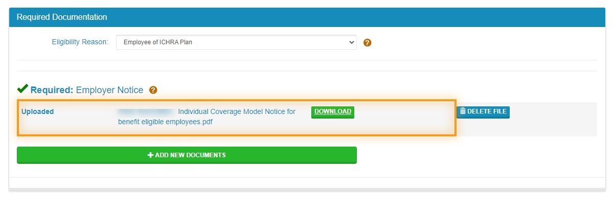 Prior to enrollment, your employer should have provided you with an ICHRA Notice that you are required to upload. This is sometimes referred to as your 90 ICHRA Notice, this notice explains your employer's decision to administer an ICHRA Sponsored Plan. *If you do not have this notice, please contact your company's Human Resource team.